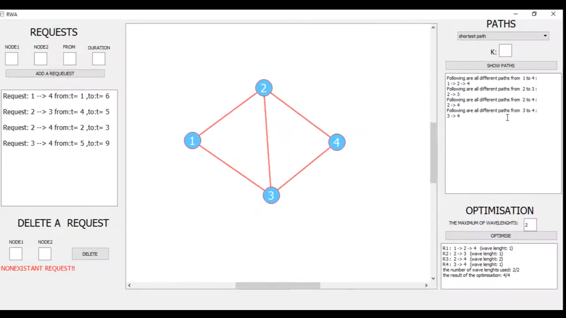 Prototype of a solution to the Routing and Wavelength Assignment problem (RWA).